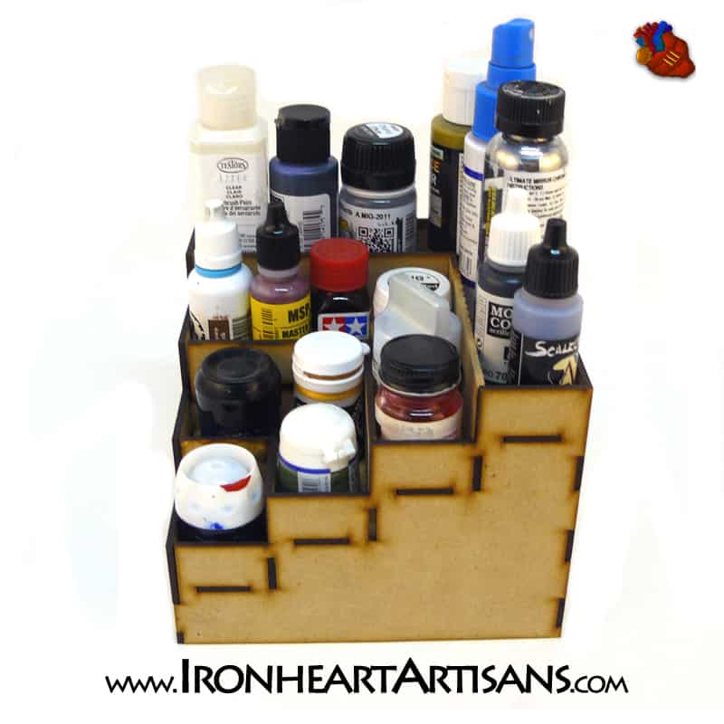 If you are anything like us you have piles of different miniature paint companies products to try to organize and special cut to fit sizes just make things even more irritating. Each level has a depth of 35mm for however and whatever you want to place on it. The footprint of the rack is only 6in by 6in which also means it will not dominate your work space. This 4 tier corner paint rack gives enough height in each level to easily see the product behind it and also has a tall enough lip that your paints won’t fall out if you bump or jar the rack.