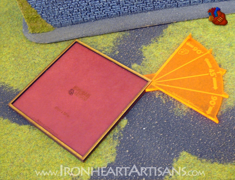 The Corner Fire Arc Template is designed to give you a guide to easily see 90 and 45 degree arcs on the corners of square based units and models. Also it can be lined up at at the front of a war engine or bit of artillery to define those 90 and 45 degree fire arc. End those annoying disputes on fire arc now with this sturdy template.
