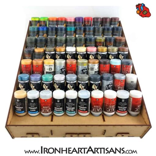 Most miniature dropper bottle paints fit nicely in the rack. The following brands have been test fitted Vallejo Secret Weapon Washes Scale 75 Reaper Master Series Army Painter If your brand of paint is not listed here contact us and we will find out if it will fit for you.